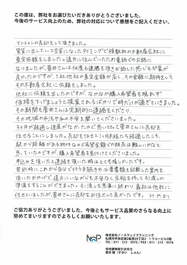 マンションを売却して頂きました。賃貸に出していて空室になったタイミングで複数社の不動産会社に査定依頼をしました。遠方に住んでいたため電話でのお話になりましたが、菅井さんは何度も連絡を頂きお話した感じも印象が良かったのですが、1社他社の査定額が高く、その金額に期待してその不動産会社に依頼をしました。